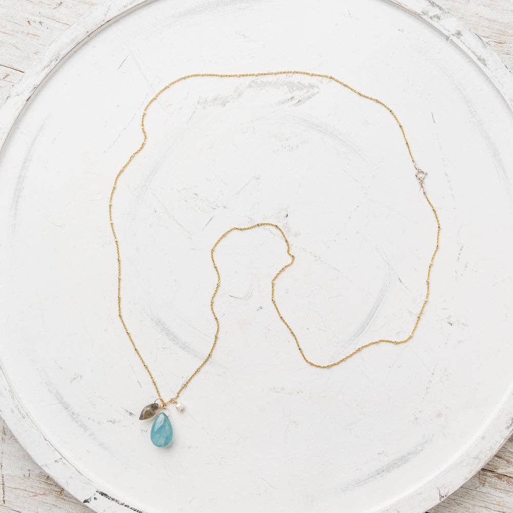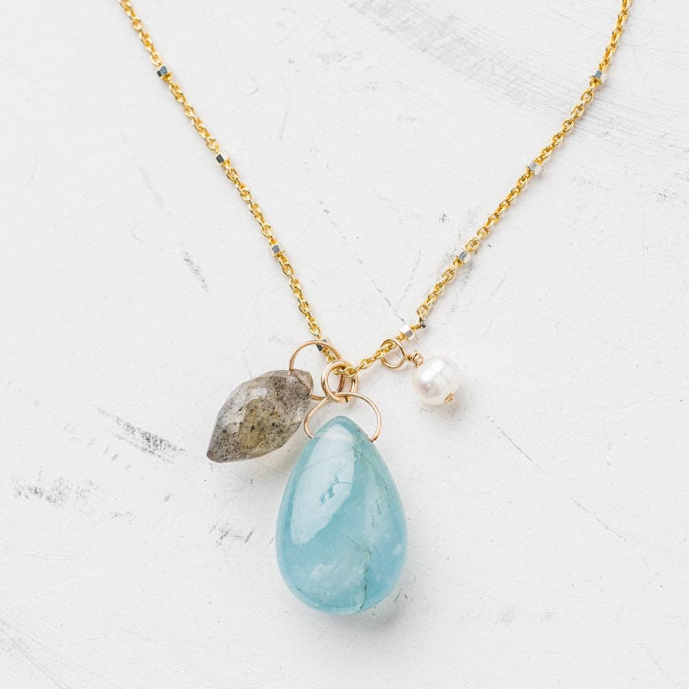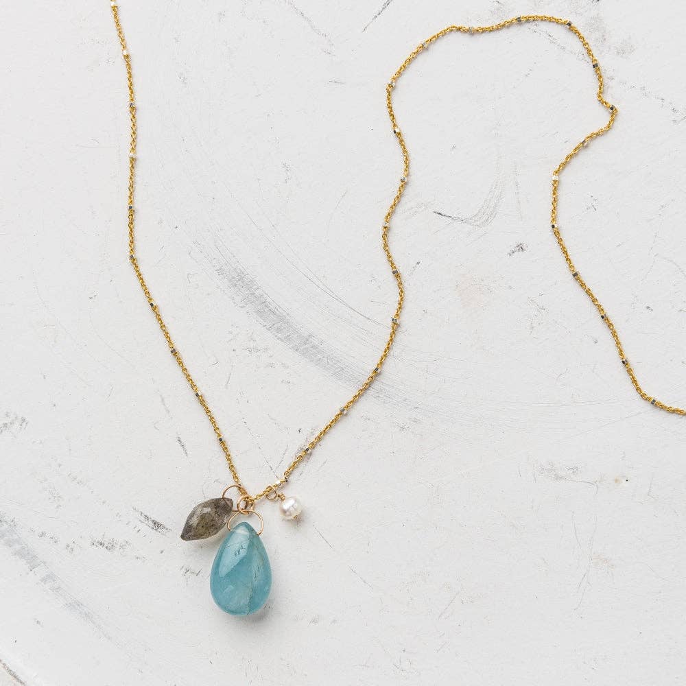 Original Hardware Aquamarine Smooth Pear Opera Necklace with Labradorite and Pearl