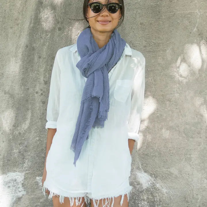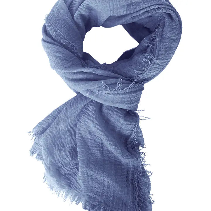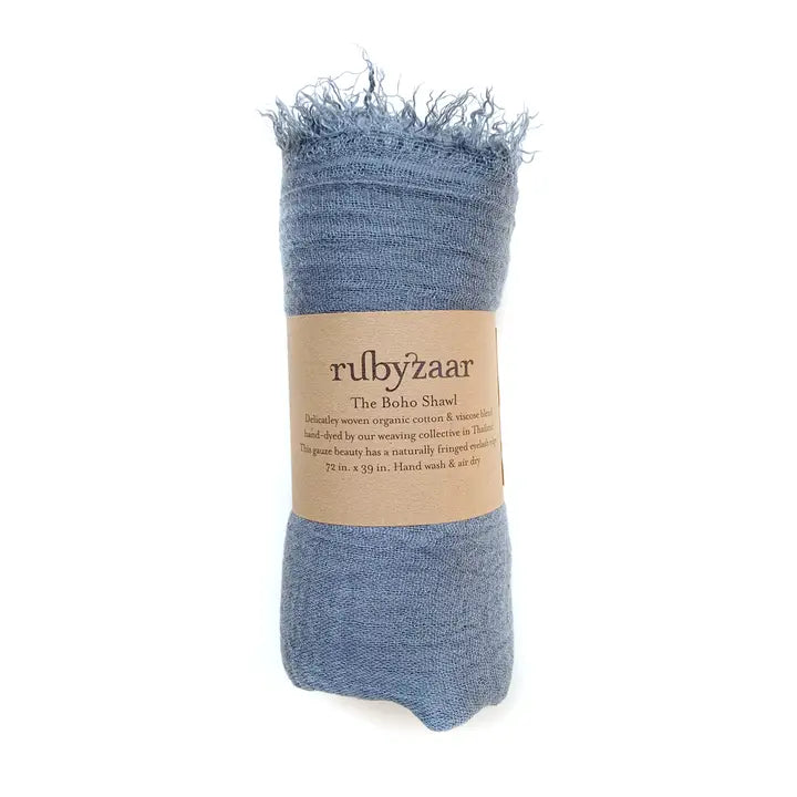 Delicately woven cotton & viscose shawl. Hand dyed by our weaving collective in Thailand. This gauze beauty has a naturally fringed eyelash edge. 72” x 39” Our best selling bohemian style scarf is the perfect accessory for any occasion. Buttery soft and fabulous. 80% cotton, 20% viscose Hand or machine wash gentle cycle