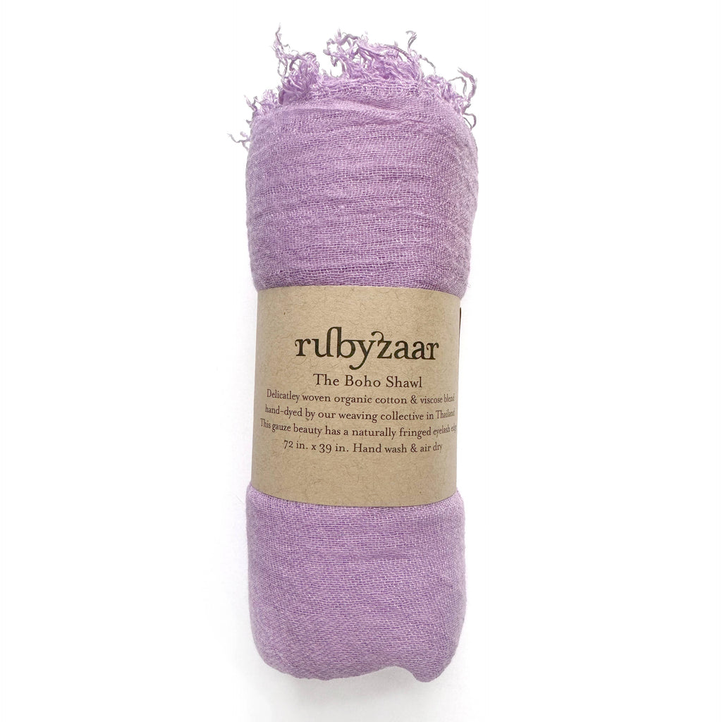 Delicately woven cotton & viscose shawl. Hand dyed by our weaving collective in Thailand. This gauze beauty has a naturally fringed eyelash edge. 72” x 39” Our best selling bohemian style scarf is the perfect accessory for any occasion. Buttery soft and fabulous. 80% cotton, 20% viscose Hand or machine wash gentle cycle.
