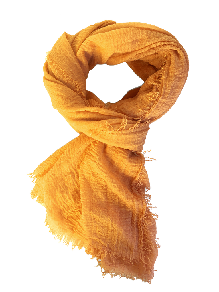 Delicately woven cotton & viscose shawl. Hand dyed by our weaving collective in Thailand. This gauze beauty has a naturally fringed eyelash edge. 72” x 39”