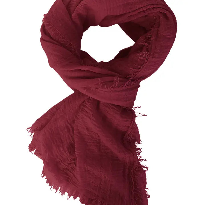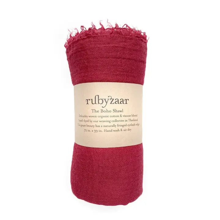 Delicately woven cotton & viscose shawl. Hand dyed by our weaving collective in Thailand. This gauze beauty has a naturally fringed eyelash edge. 72” x 39”