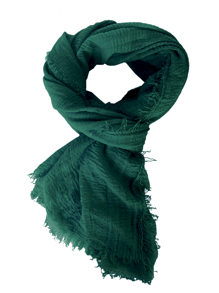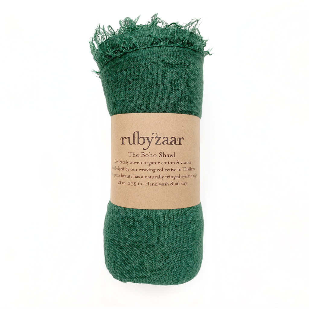 Delicately woven cotton & viscose shawl. Hand dyed by our weaving collective in Thailand. This gauze beauty has a naturally fringed eyelash edge. 72” x 39”