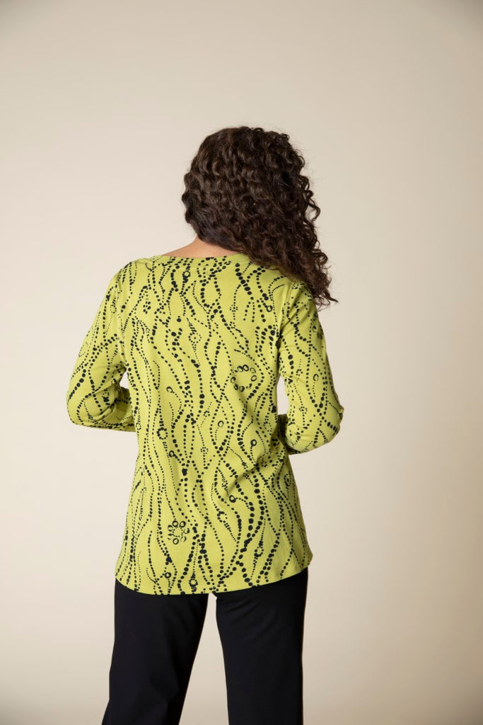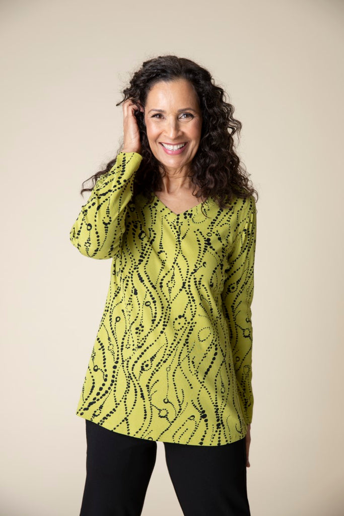 Expertly crafted with a cozy rib knit and playful wavy dot design, this V-neck tunic offers a relaxed fit and full length sleeves. Experience effortless comfort with machine washable cold gentle cycle, non-bleach instructions, and a cool iron option when needed.