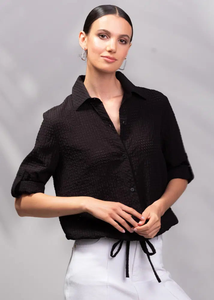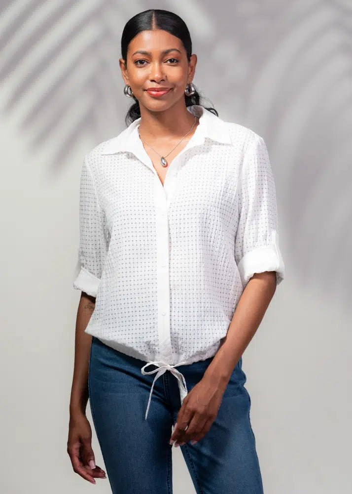 Experience effortless elegance with our Alison Sheri Eyelet blouse. Crafted from luxurious knit fabric, this white or black blouse boasts a button front, charming tie detail, and elegant long sleeves with tab detail. Add a touch of refinement to any outfit with this versatile piece.