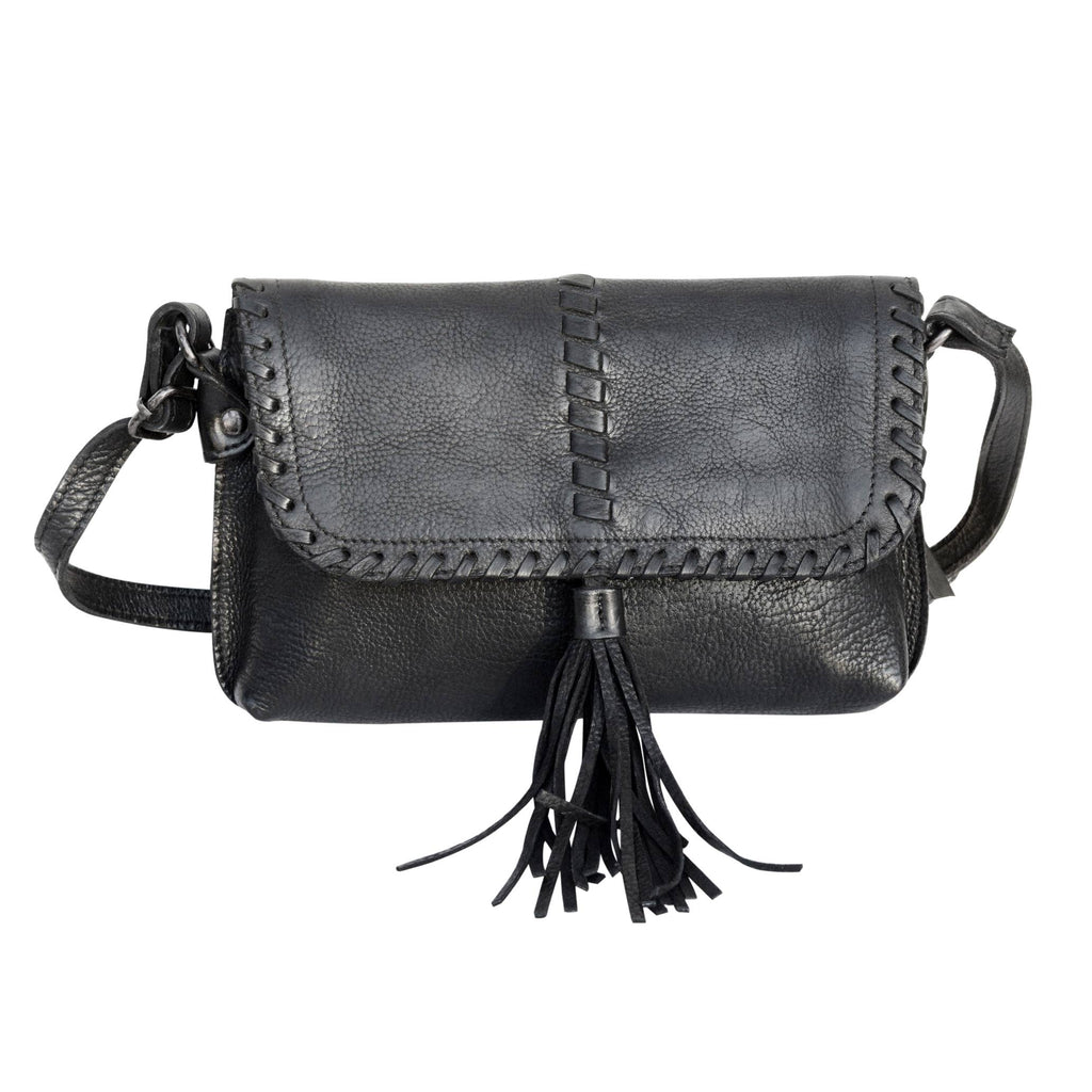 6.25”H x 2”D x 9”L - Contemporary western with modern aesthetic - Top flap opens to reveal secure zip entry - Exterior back zip pocket, leather whipstitching + center tassel - Interior zip pocket + leather credit card slots