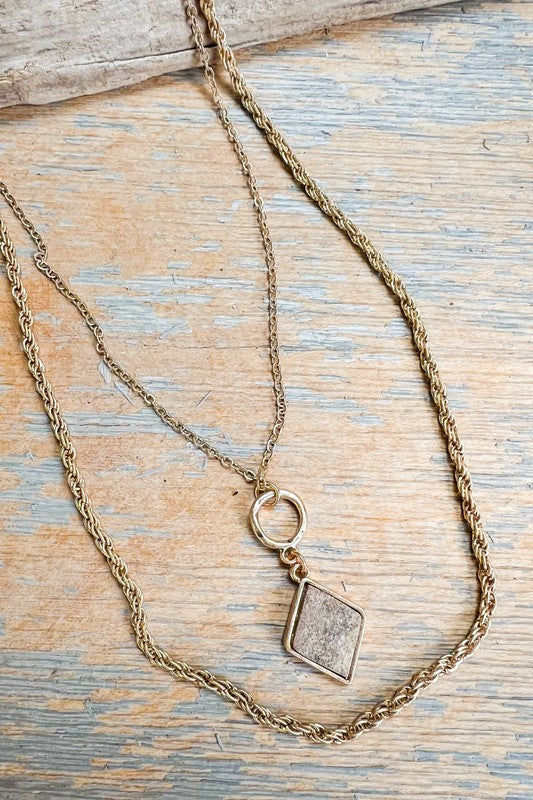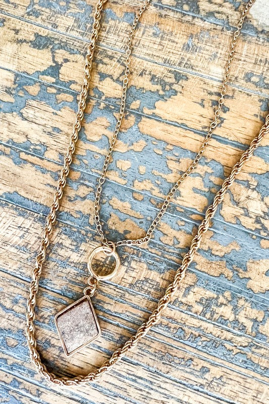 One rope chain and one cable chain necklace with a diamond stone pendant. Both include a lobster claw closure and a 3" extender.