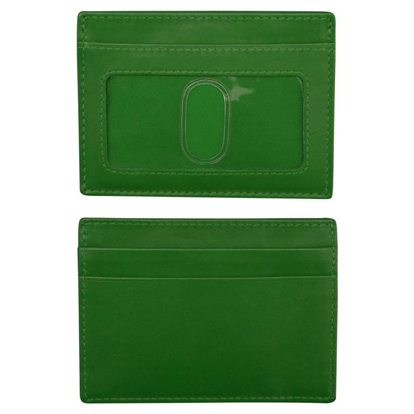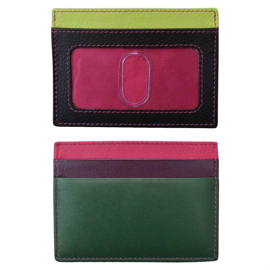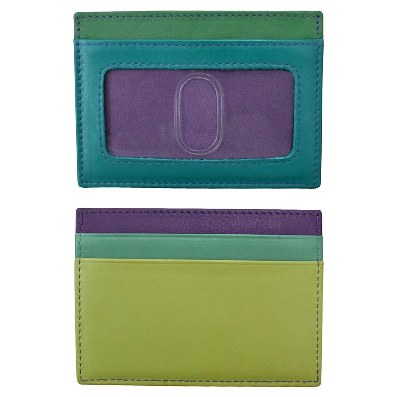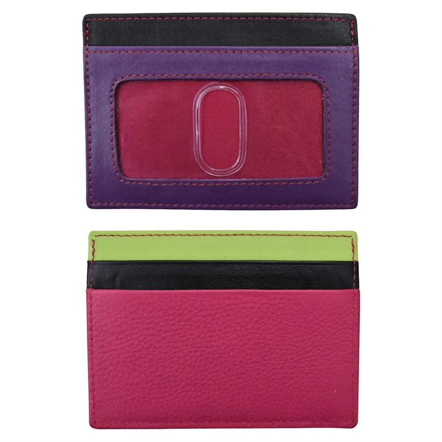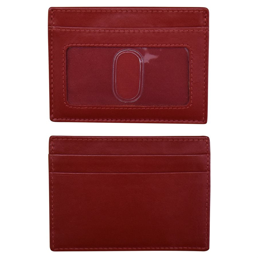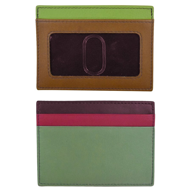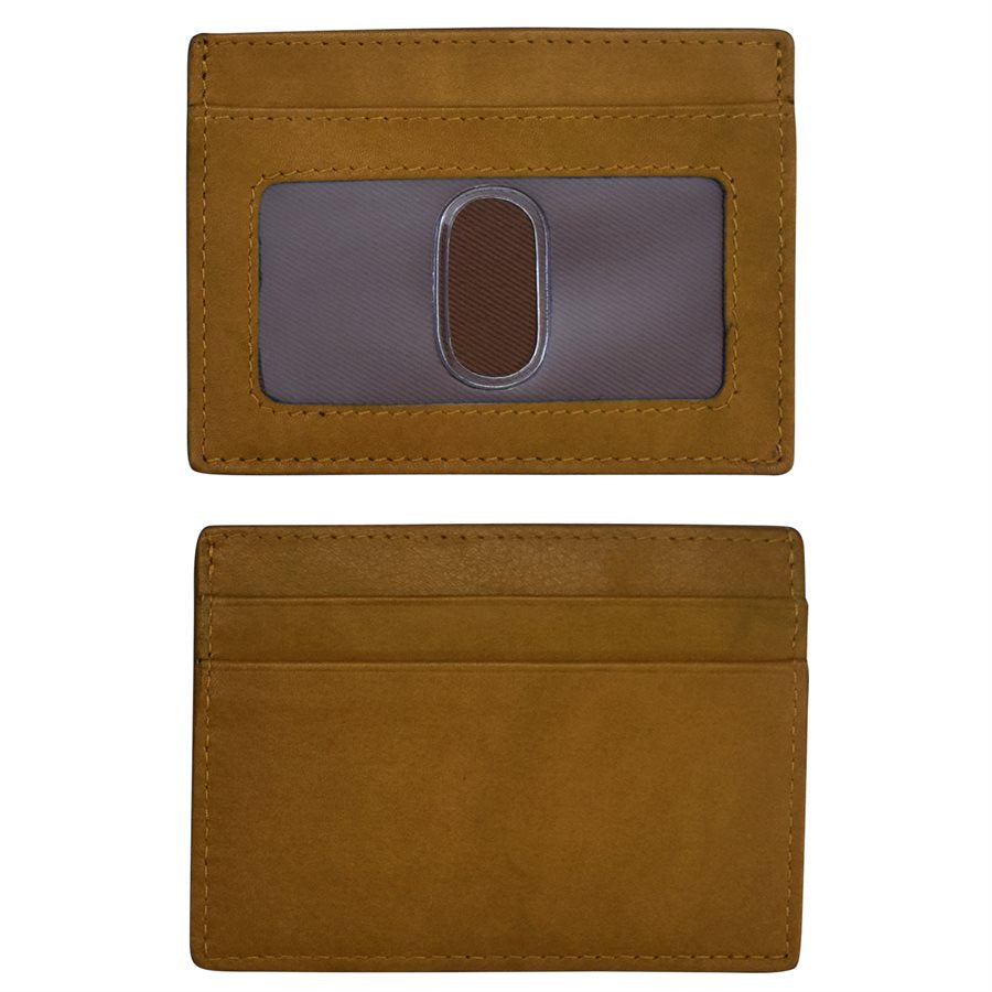 Leather ID/credit card holder with RFID blocking lining. Exterior- front ID window, back two credit card slots, and one top entry slide pocket. Dimensions: 4 x 3 x .1 in.