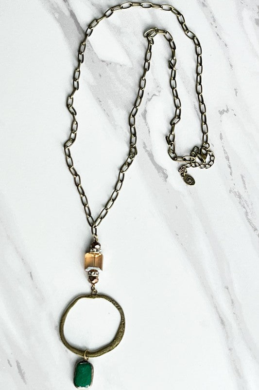 Long bronze chain with bead and soldered pendant. Includes lobster claw and 2.5" extension.