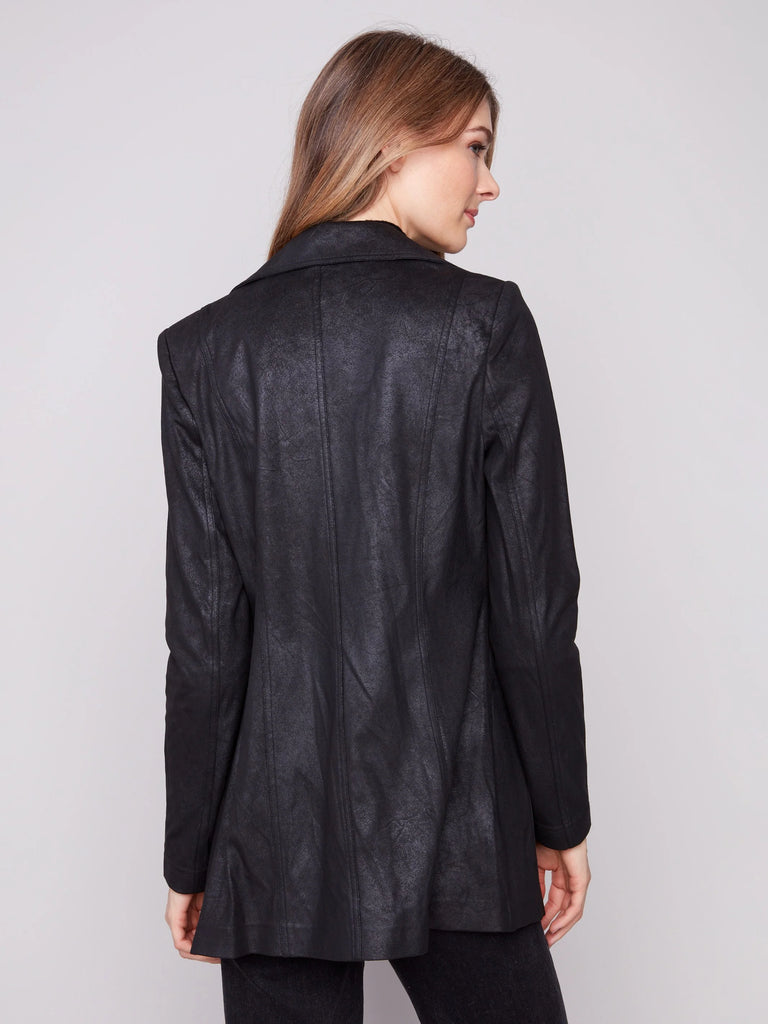 Make a statement with this striking faux suede jacket. Its vintage texture in a rich black shade is crafted to enhance your outfit. With hook-and-eye closure, zipper details and a lapel notch collar, this jacket is essential for any trendsetting fall wardrobe.