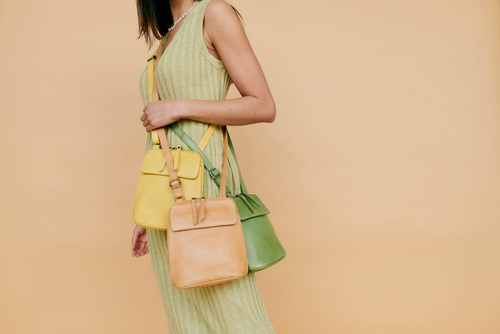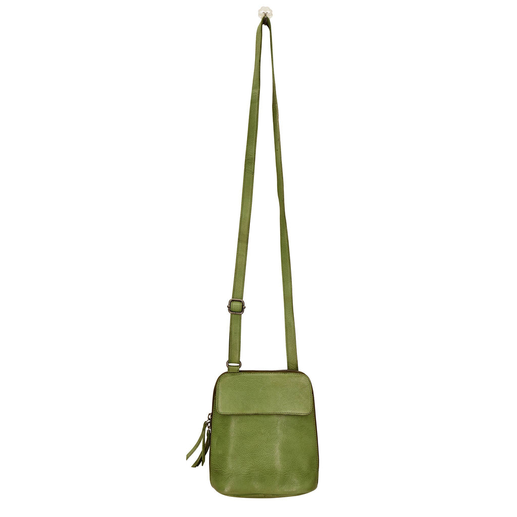 • Interior access by a zipper on three sides • 3/4" wide shoulder strap with a 28" max, 14" min drop • Exterior front has open pocket with hidden magnetic snap closure underneath flap • Interior has zip pocket, middle hanging zip pocket and open pocket • Fabric lining • Dimensions: 8 x 2.75 x 7.75