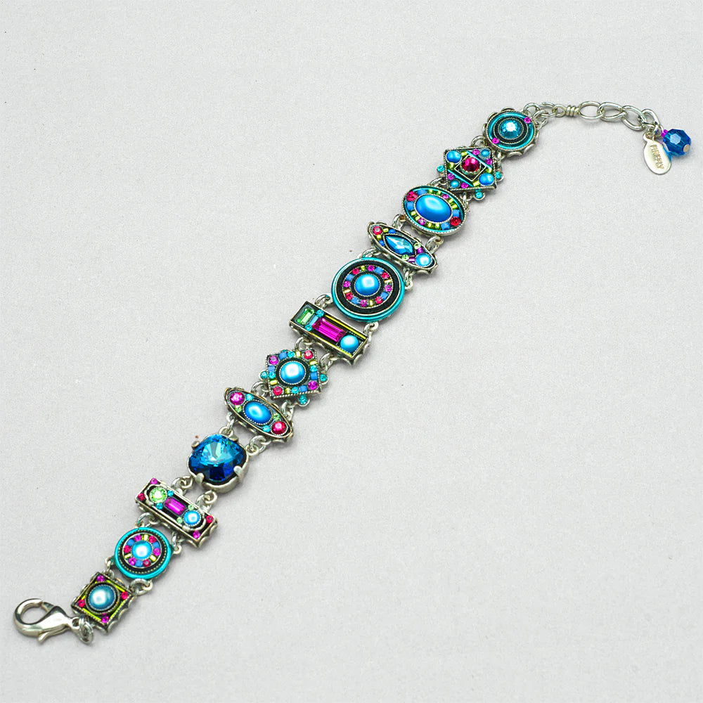 The Moonlight Bracelet-Bermuda Blue features a stunning mosaic design using high-quality European glass crystals and other premium materials. Its adjustable silver plated chain measures 7 1/4" to 8", ensuring a perfect fit for any wrist.