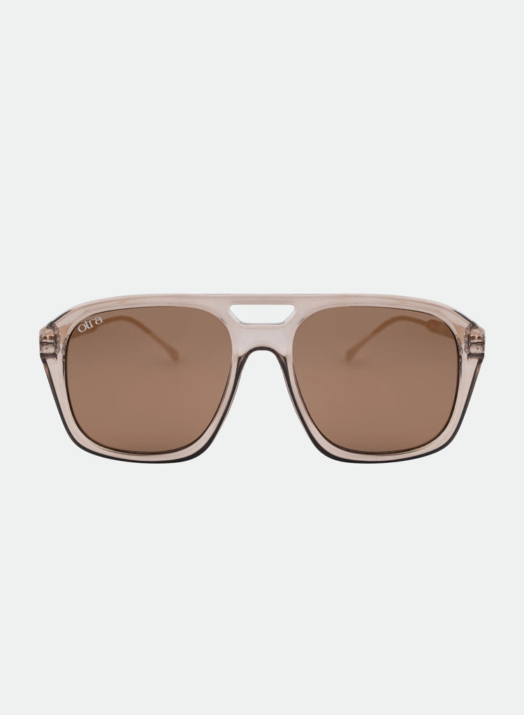 Otra Reina features oversized rounded frames in a transparent olive hue, combining gentle contours with a touch of subtle boldness. The warm brown lenses add a refined contrast, perfectly merging contemporary comfort with classic vintage charm. This design makes a calm yet confident statement, ideal for seamless everyday wear.