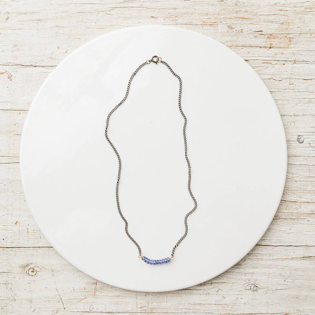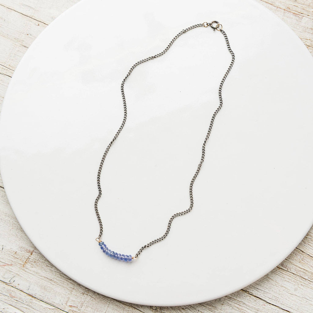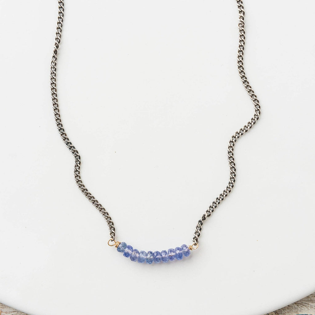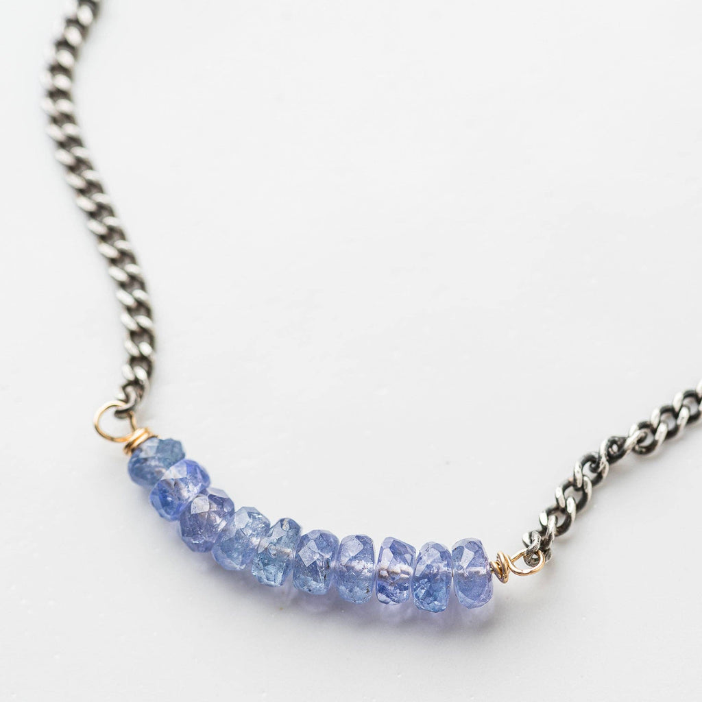 This necklace features tanzanite paired with an oxidized curb chain, creating a balanced combination of boldness and sophistication, resulting in a timeless and graceful appearance.