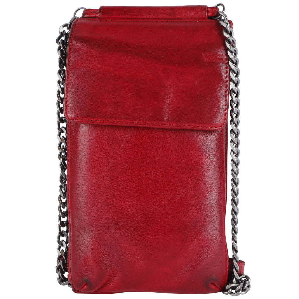 Gunmetal and leather combination cross body strap 1/4” wide -23” max:11 1/2 “min. drop Exterior features magnetic snap closure front flap, side zip entry for cell phone Interior features 6 credit slots Fabric lining Dimensions: 7.5”H x .5”D x 4.25”L