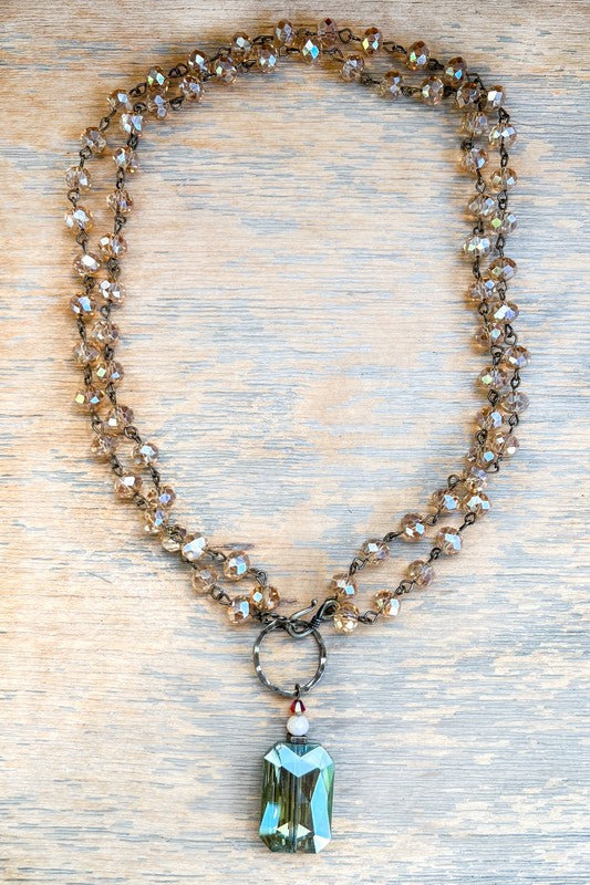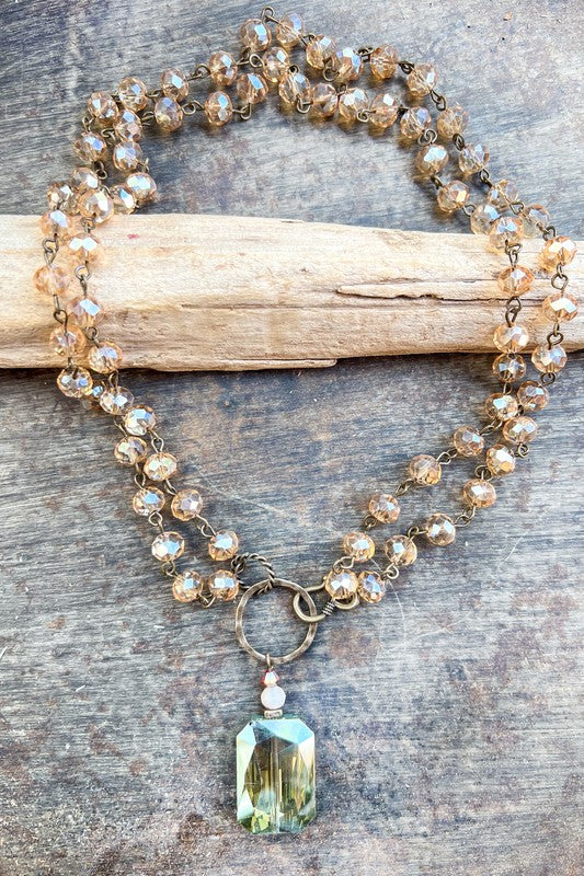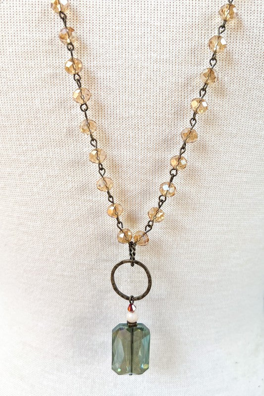 This chain and bead link necklace has bronze links and taupe blush translucent beads. It has a blue translucent pendant attached by a jump ring. This necklace can be worn long or short by attaching the small hook to the jump ring for a double layer-look.