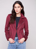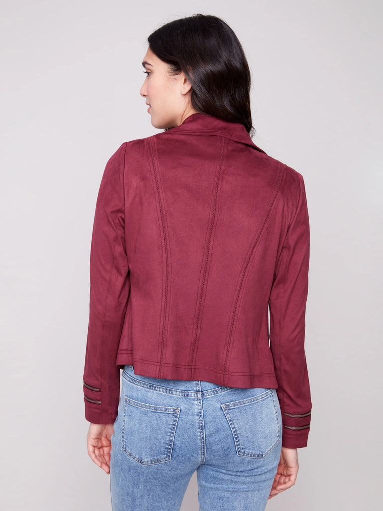 Make a statement with this timeless cabernet red faux suede jacket, highlighted by zipper accents and a lapel notch collar. Its luxurious texture and modern style offer versatility, perfect for dressing up at night or adding a sophisticated touch to your casual weekend attire. This enduring jacket effortlessly elevates any ensemble.