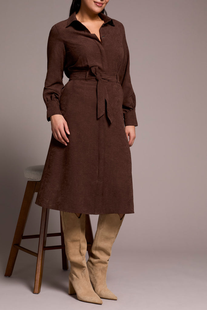 Experience elegant charm with this flowy shirt dress, showcasing a traditional buttoned front and a sophisticated collar for enduring style. The adjustable tie belt defines the waist for a flattering silhouette, while the soft faux suede fabric provides a luxurious touch and polished look.