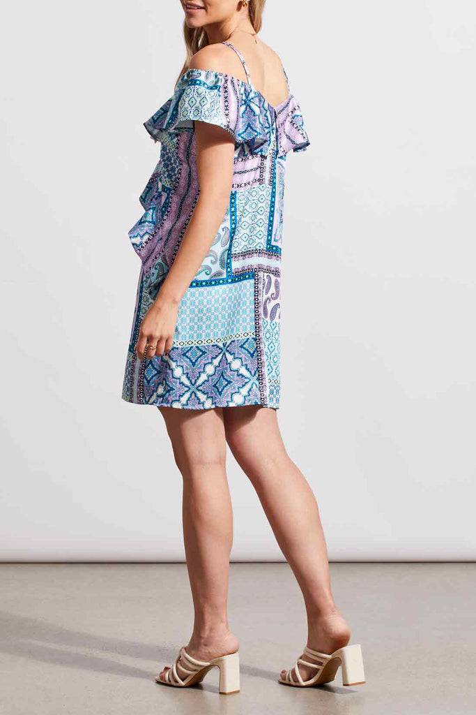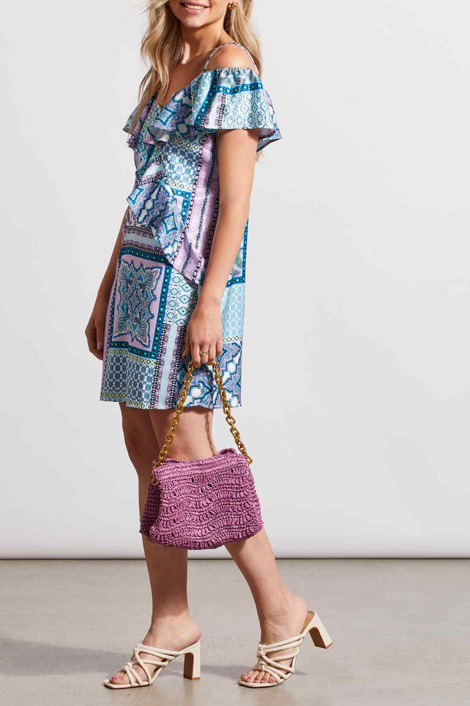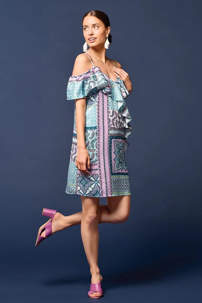 This dress offers versatile styling with ruffled sleeves that can be worn on or off the shoulders. The satin fabric acts as a smooth canvas for the vibrant patchwork-style print, allowing you to switch up your look effortlessly.