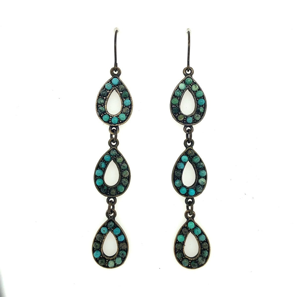 Rebel triple tear drop dangle earrings. Antique brass finish with African turquoise semi precious stone beads. Handmade in New York. Style #1376.