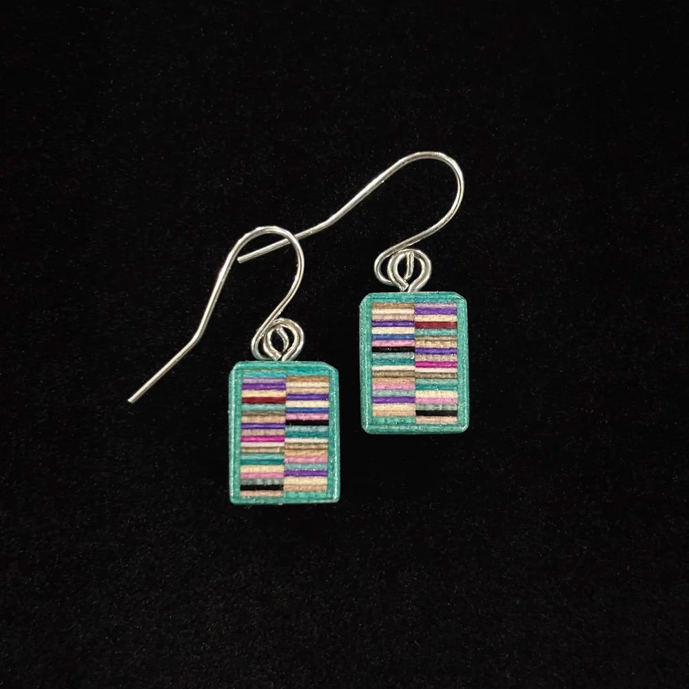 Each pair of these artisan wood earrings showcases a vibrant blend of hand-selected hardwoods, dyed and natural, creating one-of-a-kind color combinations. Meticulously crafted through individual cutting, sanding, and lacquering, they're designed to be comfortable enough for everyday wear while celebrating the natural beauty of wood grain. Perfect for adding warmth and personality to any look.