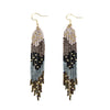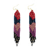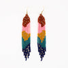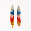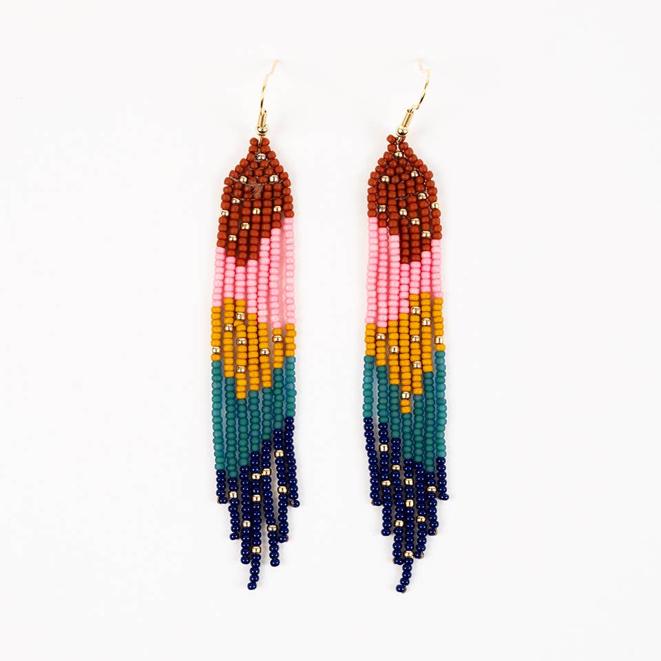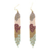 Cascading colors of glass seed beads with 24K Gold plated Japanese glass beads sparkle throughout this fringe earring. Secured with a gold plated brass ear wire.