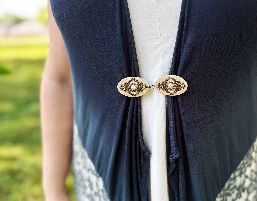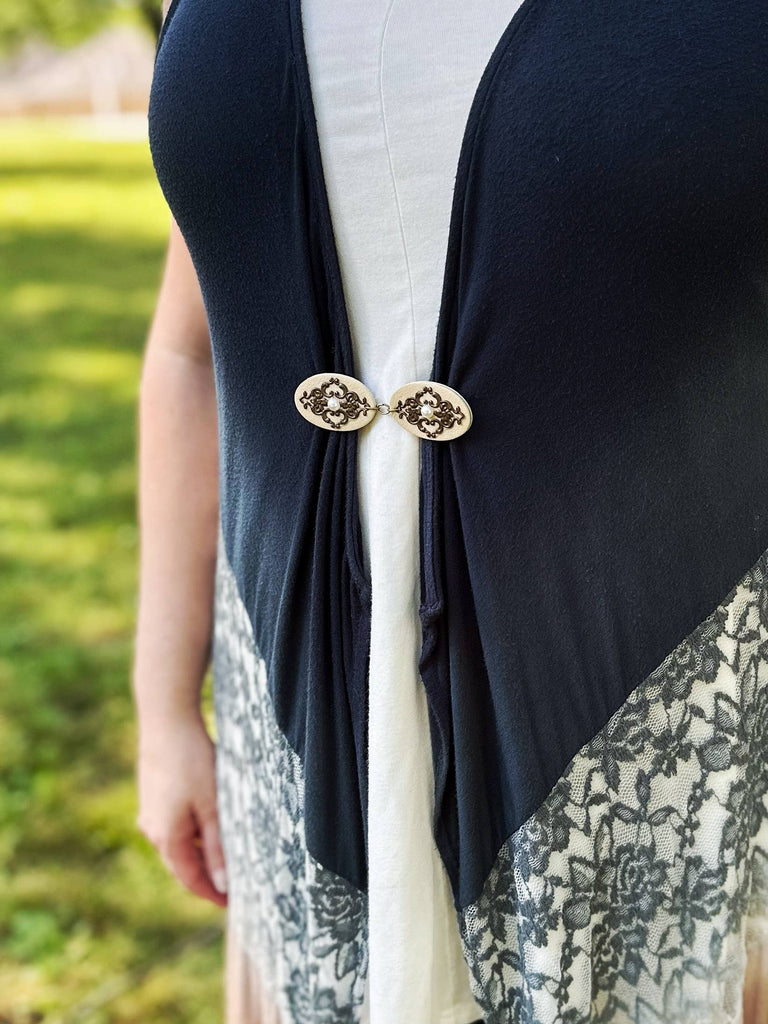 The “Romantics” Collection – These timeless classics act as tiny, tasteful, modern mini-tailors! Double bronze ornate metal scroll on a base of beige leather. A pretty, dainty Victorian look that adds an elegant touch to any outfit. Each Klip features our new & improved grip clips, with a wide mouth to hold thick fabrics securely & open easily. Now includes a pair of removable silicone sleeves to protect more delicate fabrics. 3.5” long x 1” wide Doubled Oval or Squared-off Diamond Mini-Tailor Magic: Ideal for cardigans, sweaters, dresses, shirts, and tunics, KardiKlips™ & Kardi-Pins® provide a pretty & discreet way to hide bulges and problem areas, allowing your customers to highlight the curves they're proud of and achieve a nipped-in appearance where they want it! Packaged on a display card, sealed in a clear plastic bag. ©2020 Ashley Grove. All Rights Reserved