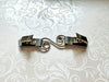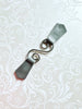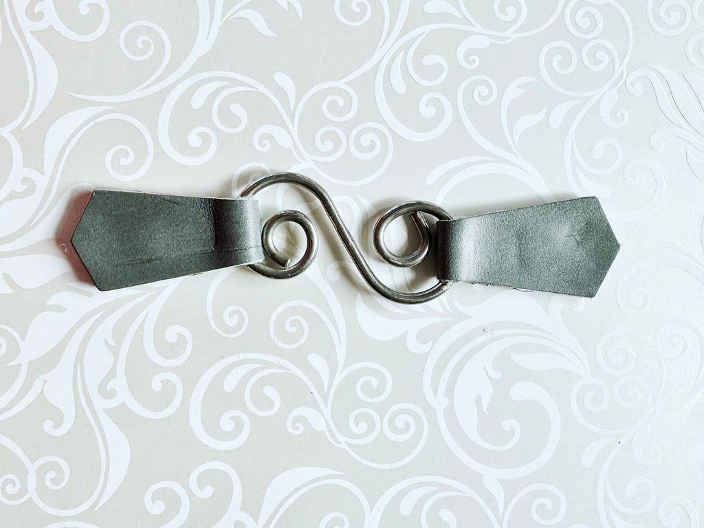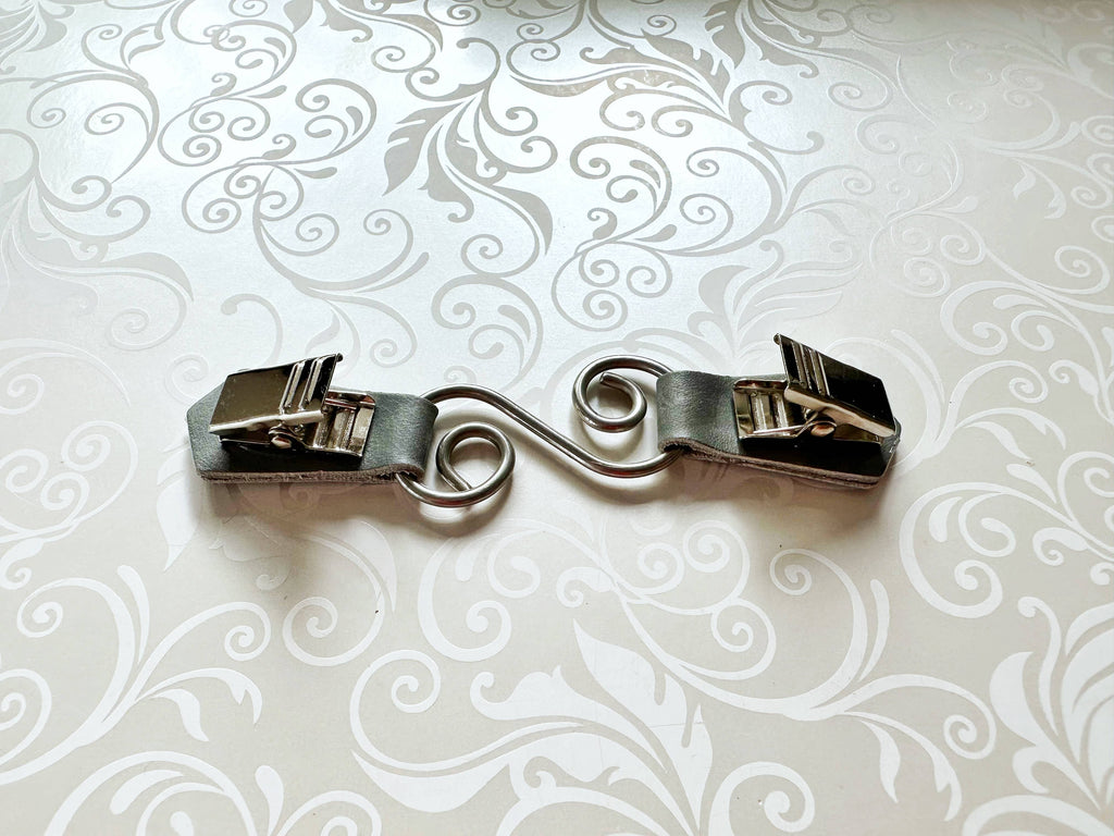 Silver spiral metal hardware connects greenish-gray leather tabs on either side with grip clips hidden on back.