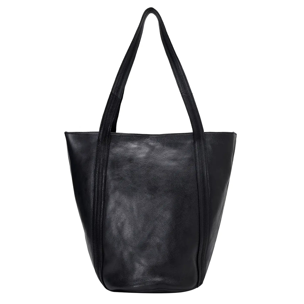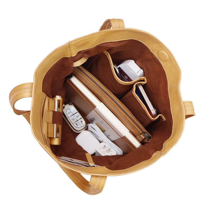 Crafted from quality leather, this handsome tote combines thoughtful design with everyday practicality. The spacious silhouette measures 13.5"H x 14"L x 8.25"D with a distinctive round bucket base, while the 2 5/8" carry handle offers a comfortable 9" drop. Inside, you'll find a zip pocket and slip pocket for organizing essentials, all lined with durable cotton twill. A striking contrast stitch detail adds character and visual interest to this versatile companion.
