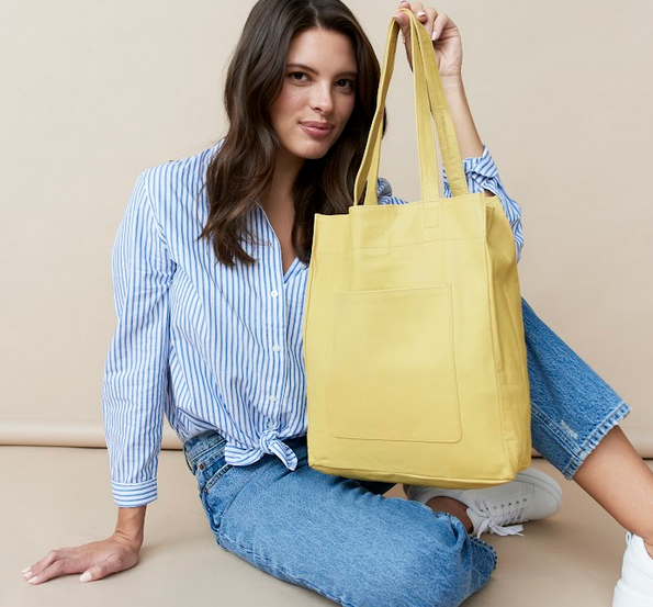 Dimensions: 14.5"H x 4.5"D x 12"L Margie: 100% Leather, Top features hidden magnetic snap closure, (2) 3/4" wide carry handle with 10" drop, Exterior features slit pocket, Natural raw interior.