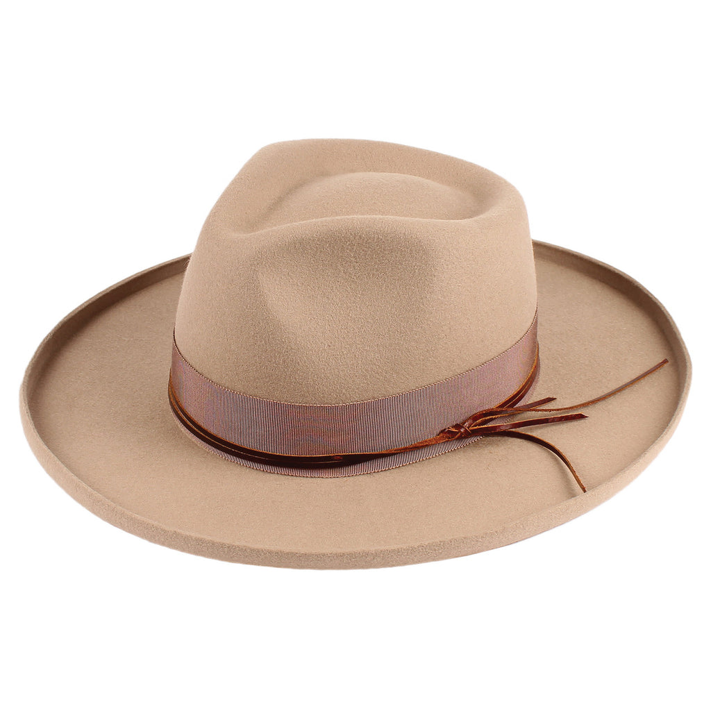 Unisex Hat - Wool Felt, 3" brim, 1/2" kettled brim, 1/2" leatherette matching band, stiff brim, elastic tie in sweatband, Medium - 57cm