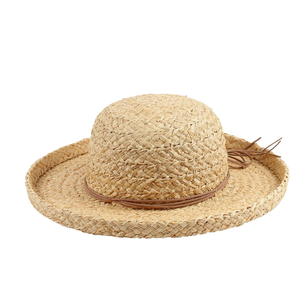 Womens Hat - Raffia, bucket crown, 3.5 inch kettled brim, wide braid, triple leather strand hat band, elastic tie in sweatband, 57cm