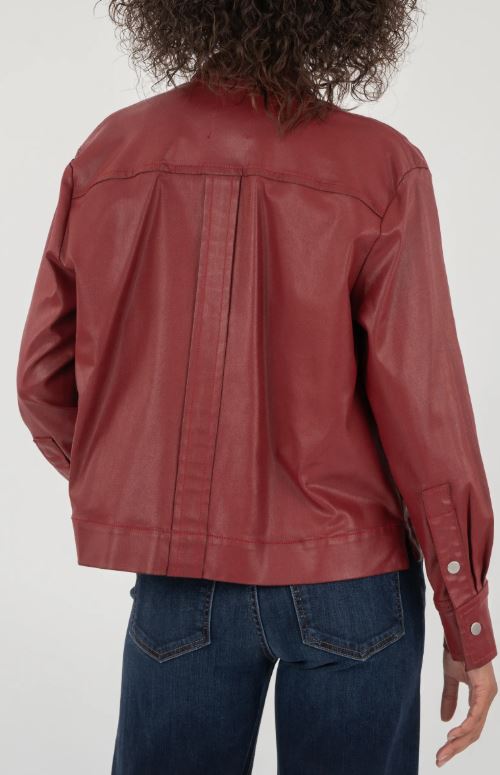 This coated jacket features dropped shoulders for a comfortable, easygoing fit, complemented by stylish silvery snaps.