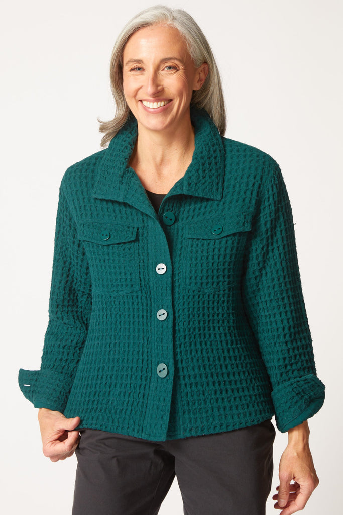 Great waffle weave texture, dyed to match buttons, cargo pockets and shirt cuffs. An on trend silhouette, fully lined and ready for travel.