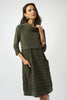 This dress combines bubble jacquard fabric with silky knit for a perfect blend of elegance and style. The empire waist shirring gently highlights the cocoon shape, and the three-quarter sleeves offer a sophisticated look. Practical front pockets enhance the design, paired beautifully with a stand collar featuring a charming back button detail.