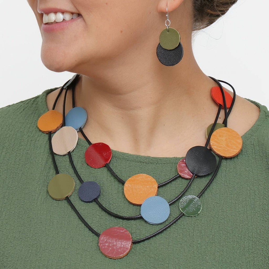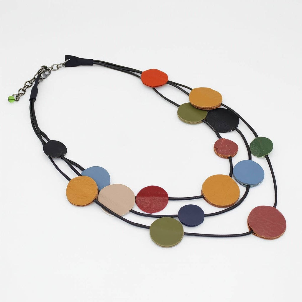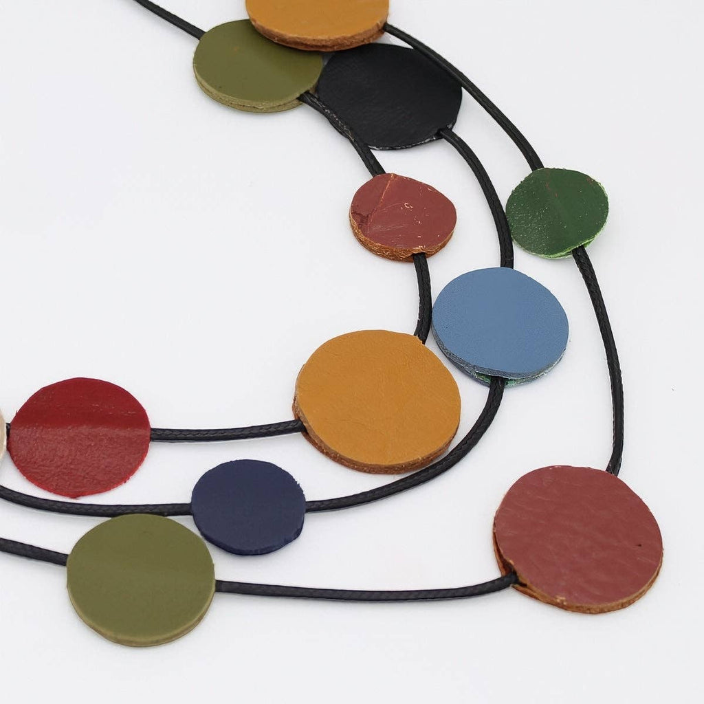 Make a bold style statement with this striking leather necklace featuring three interwoven strands of hand-selected circles in rich jewel tones and warm earth shades. The thoughtful blend of blue, mustard, green, and tan creates visual depth while the supple leather construction brings an organic, textured quality to your everyday look. Perfect for elevating both casual and dressed-up outfits with understated sophistication and personality.