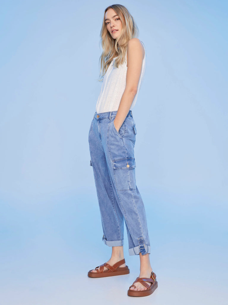 Embrace a casual look with these stylish chambray blue cargo pants. With a relaxed fit and functional pockets, they strike the perfect balance between fashion and practicality. Whether you're out exploring this spring or just relaxing at home, these versatile pants prioritize both comfort and style.
