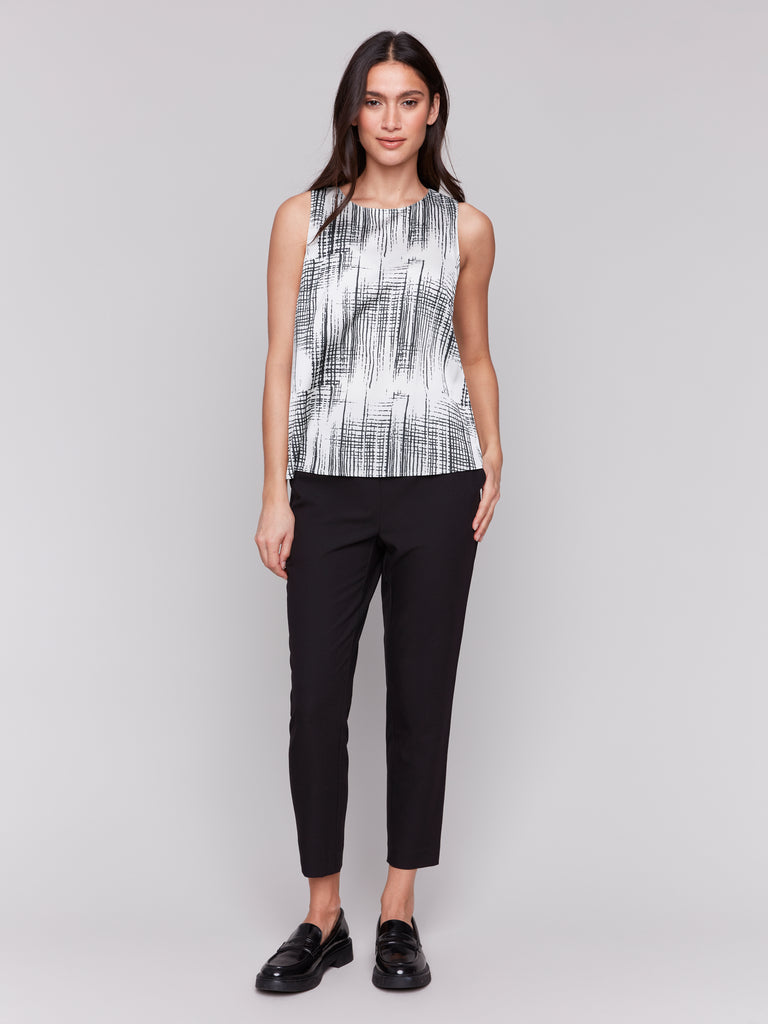 Indulge in the refined beauty of this stylish tank, ideal for all your spring events. Featuring a pepper pattern and subtle shine, this top effortlessly brings sophistication to your outfit. The small opening in the back adds a touch of femininity, making it a timeless option for those craving elegance and sophistication.