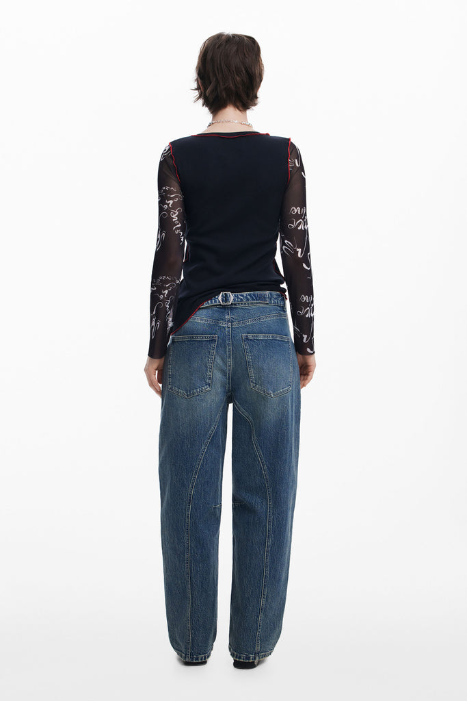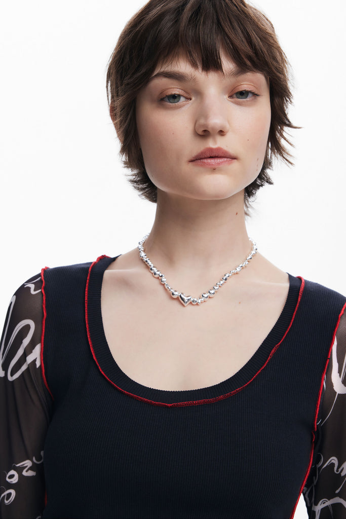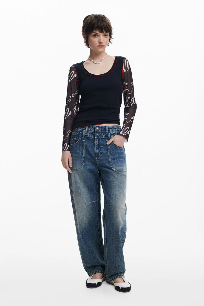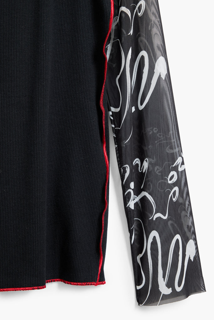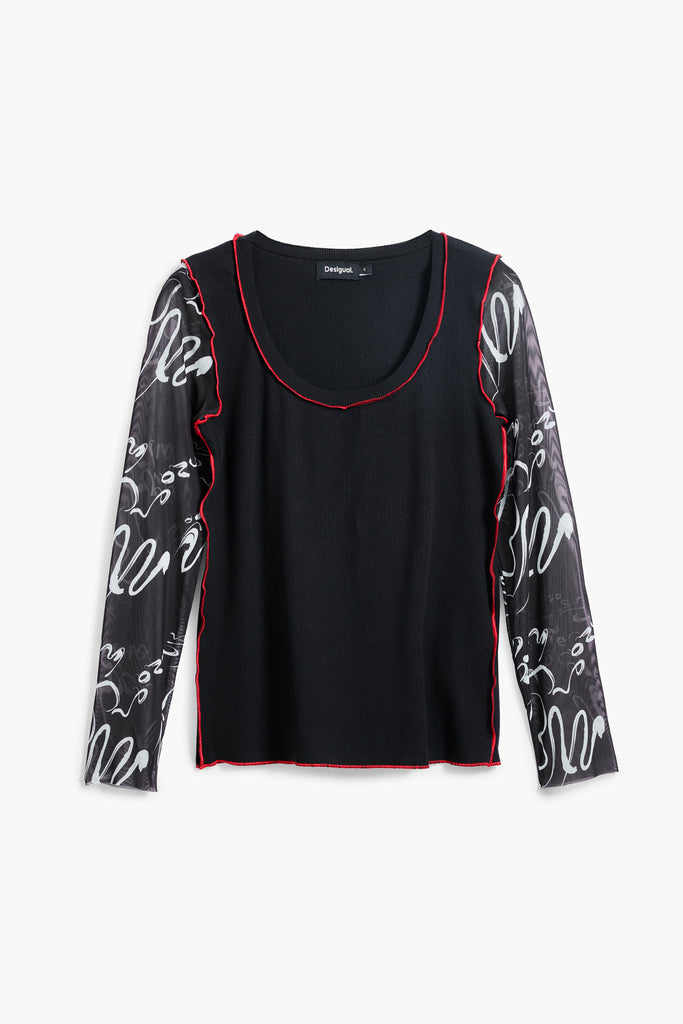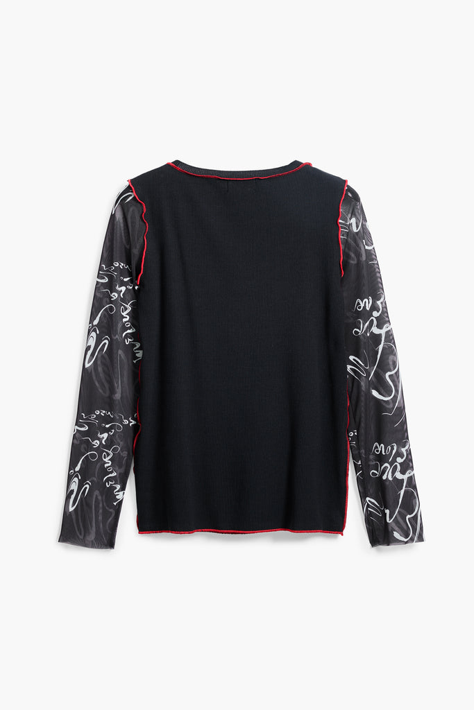Add a touch of fun and personality to your wardrobe with our Squiggle Sleeve Black Tee. The contrasting word design on the sleeves and round neckline make this long-sleeve T-shirt stand out from the crowd. You'll feel confident and stylish while wearing this unique and eye-catching shirt.