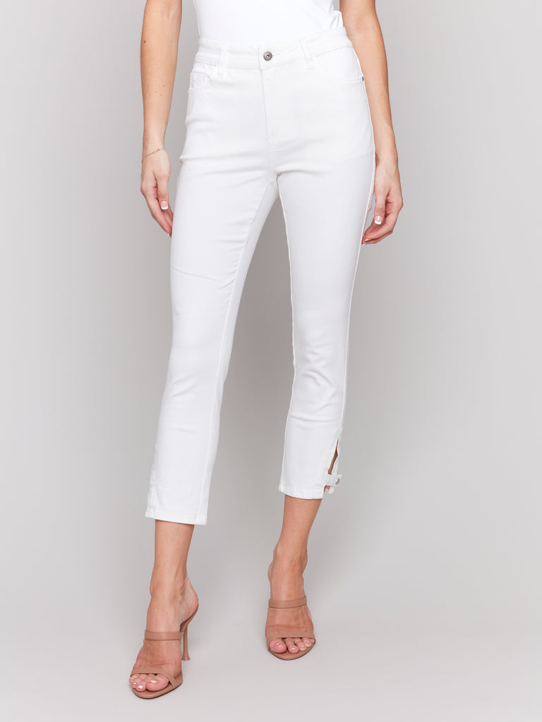 Add a pop of color to your look with these cropped twill pants in white. Featuring mini side tabs, they offer a slim fit and regular rise for ultimate comfort and style. Perfect for any laid-back occasion or to elevate your spring wardrobe.