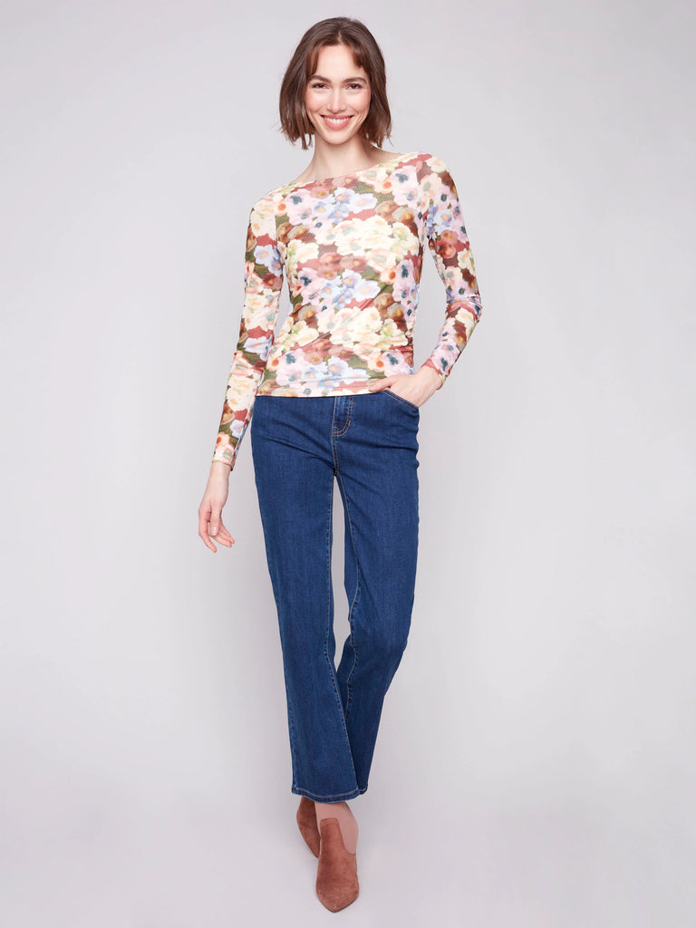 Elevate your wardrobe with this stunning mesh top that highlights elegant details. Adorned with a vibrant floral design and flattering side ruching, it brings a sophisticated flair to any ensemble. Fully lined for comfort and complete coverage, it blends style with everyday ease. This top is a perfect choice to confidently showcase your fashion sense throughout the fall season.
