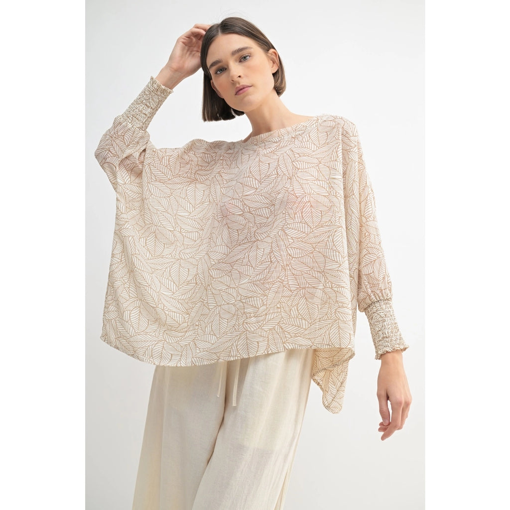 Embrace effortless elegance with the Ivory Gold Leaf Oversized Top. Its flowy silhouette drapes gracefully for a romantic touch, while lightweight fabric ensures all-day comfort. Ribbed sleeve cuffs add subtle texture and shape, creating a flattering fit that enhances your natural style. Perfect for layering or wearing on its own, this top combines comfort and charm with ease.