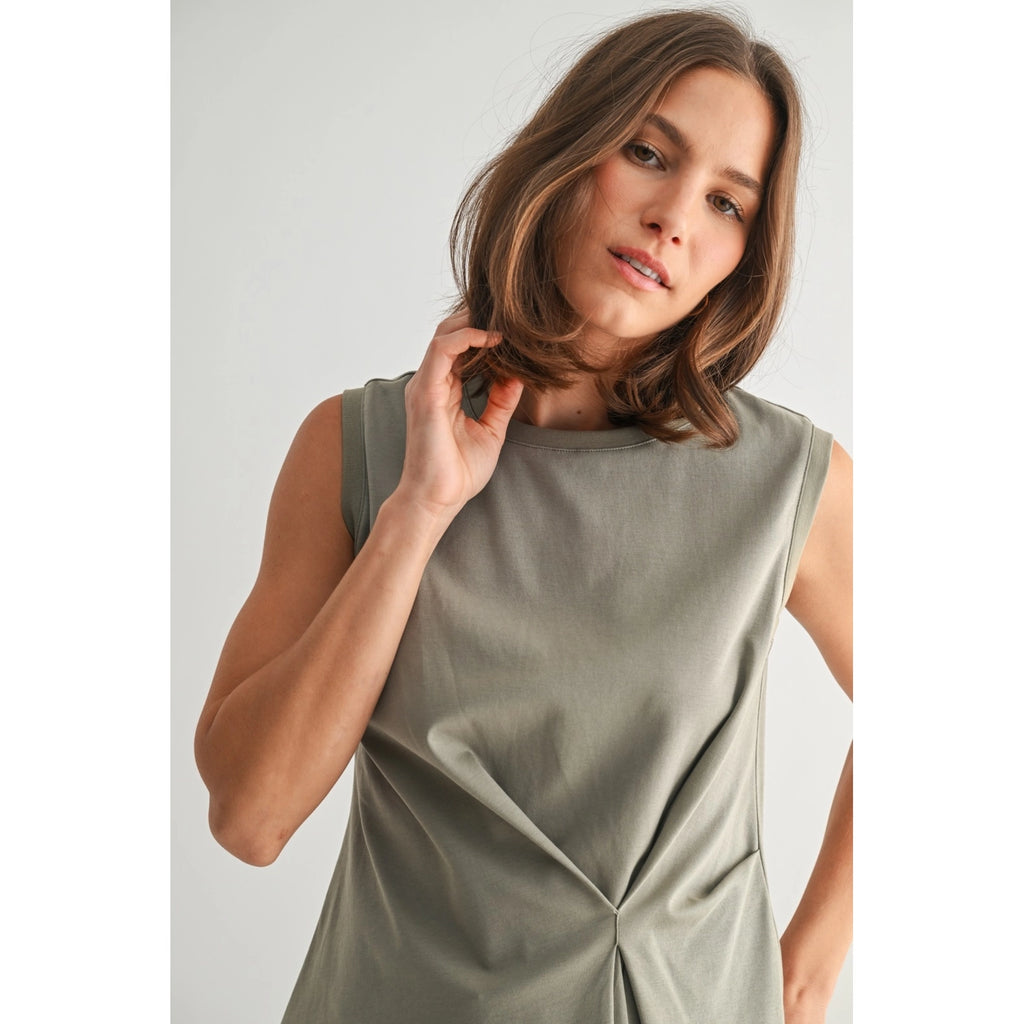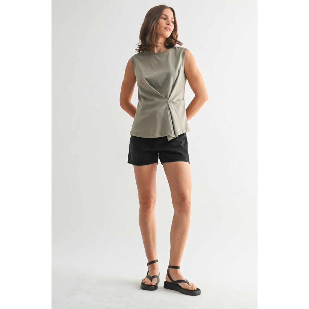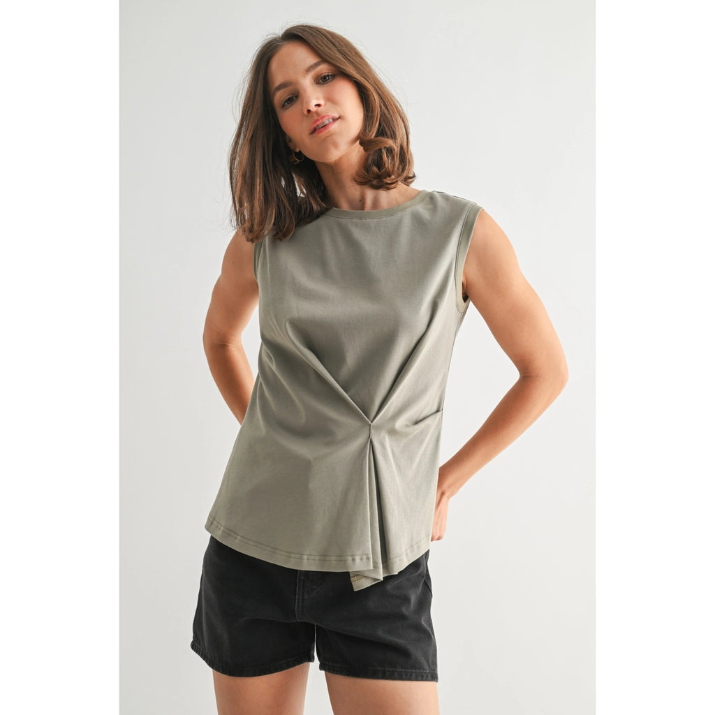 This silver olive knit tank features a flattering crew neck and an asymmetric design that adds a unique touch to your wardrobe. The front cinched pleat detail enhances shape and texture, making it a versatile piece for layering or wearing alone. Comfortable and stylish, it supports your confident everyday look with effortless charm.