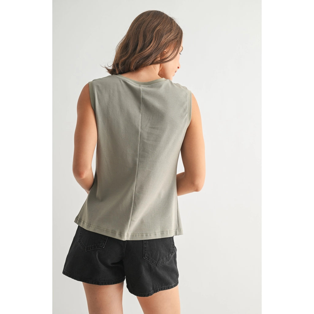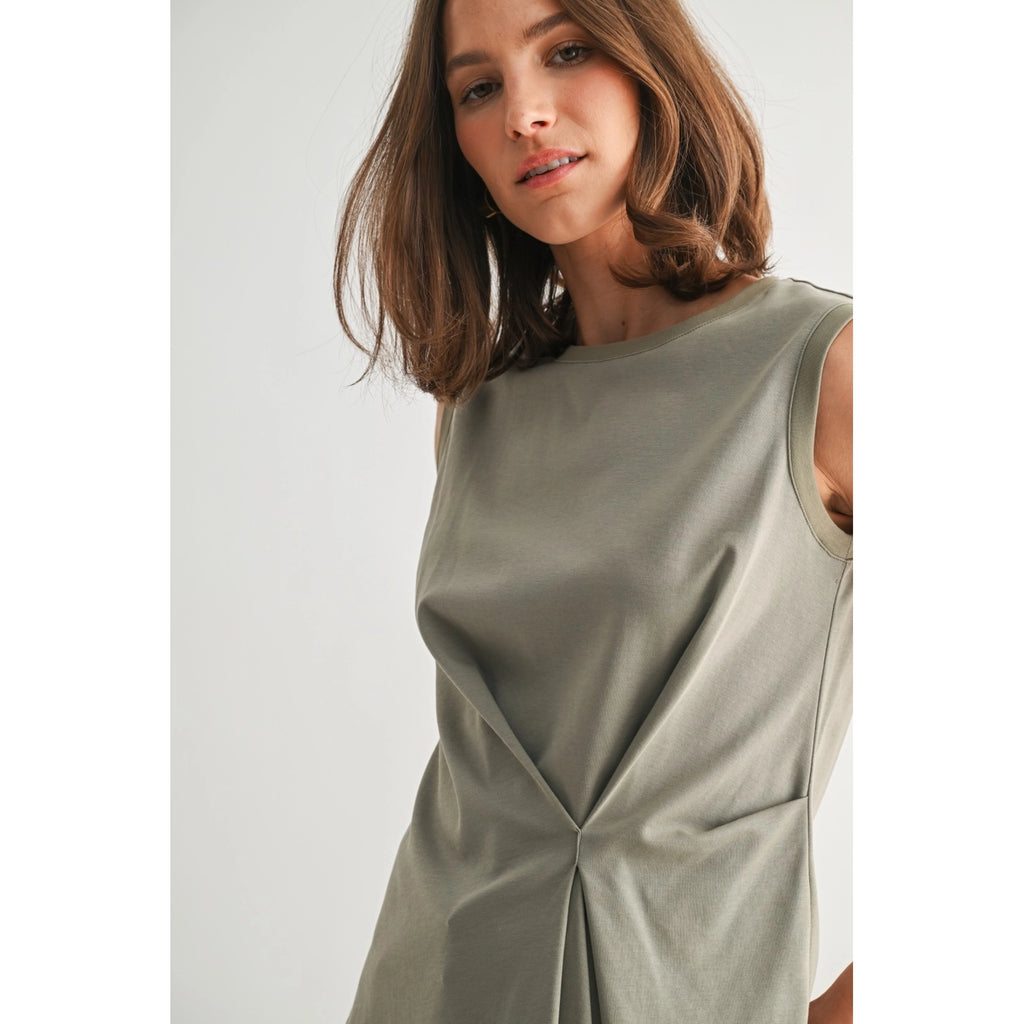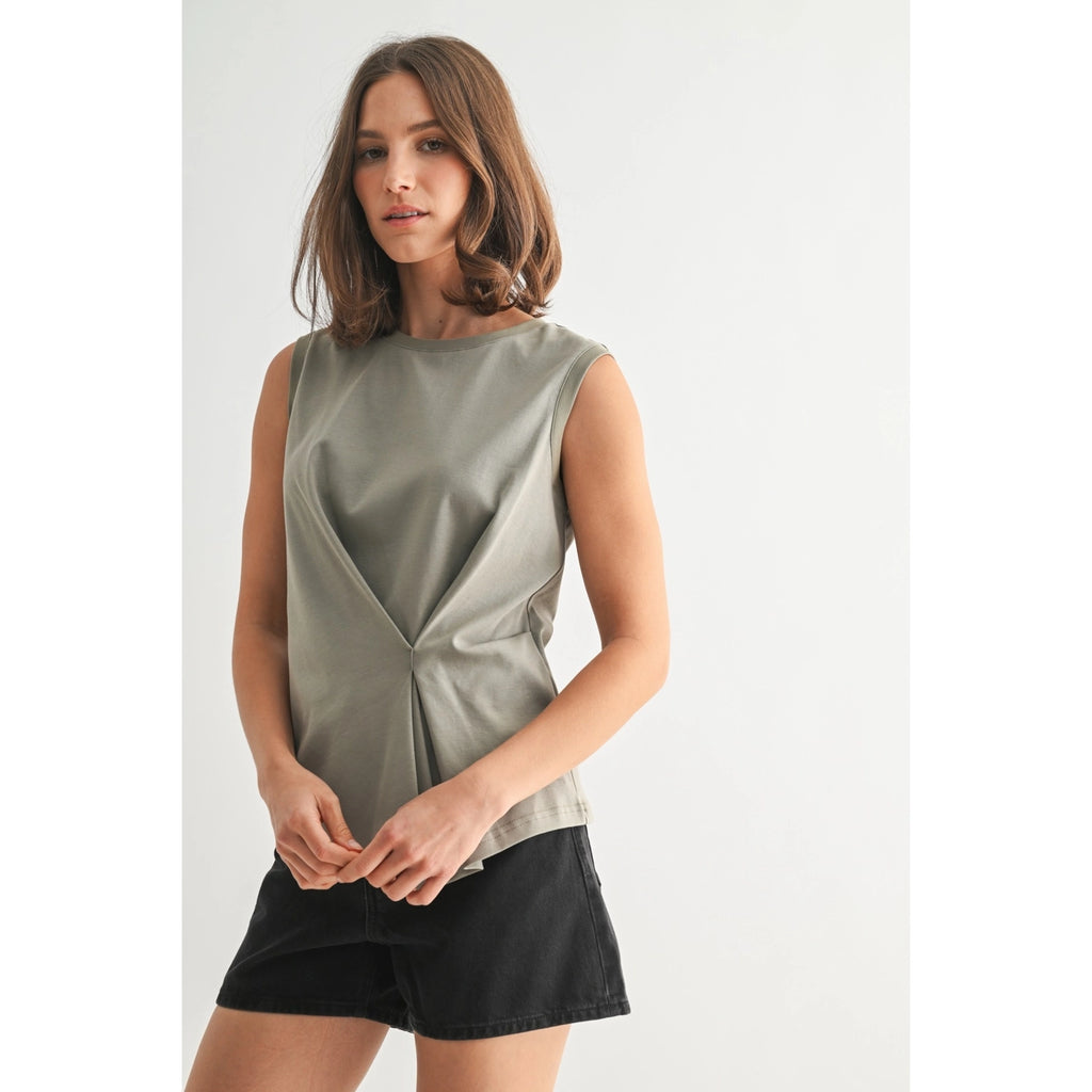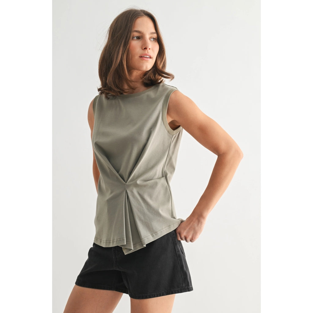 This silver olive knit tank features a flattering crew neck and an asymmetric design that adds a unique touch to your wardrobe. The front cinched pleat detail enhances shape and texture, making it a versatile piece for layering or wearing alone. Comfortable and stylish, it supports your confident everyday look with effortless charm.
