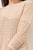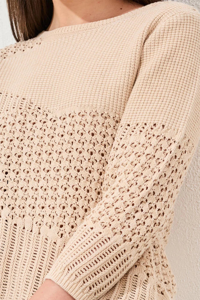 Embrace understated elegance with this textured crew neck sweater, where delicate crochet detailing pairs with a comfortable, flowing fit. The soft coco cream hue and three-quarter sleeves create a versatile piece that breathes beautifully while maintaining its shape. Perfect for layering over basics or wearing solo, it transitions seamlessly from casual to polished—pair it with your favorite denim or tailored trousers for an effortlessly chic ensemble that feels as good as it looks.