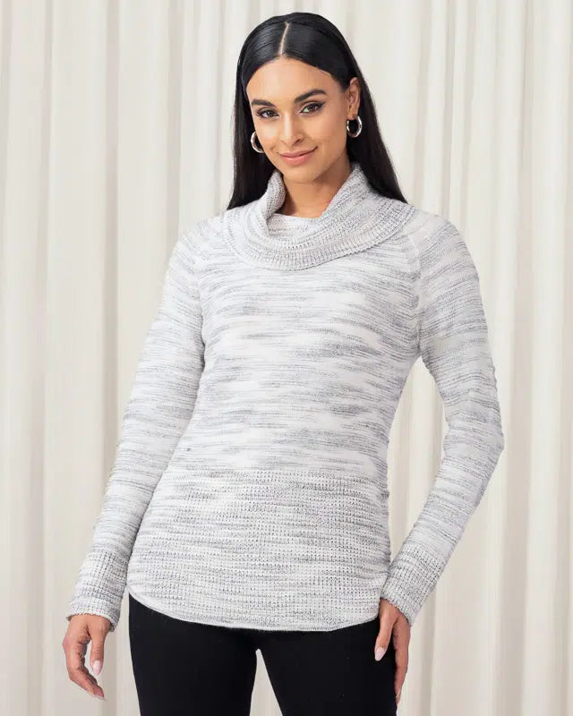 This grey and white streaked cowl neck top offers a graceful blend of style and comfort. Featuring waffle knit cuffs and hem, it ensures a snug fit while maintaining a lightweight feel perfect for layering. Its elegant design enhances your wardrobe effortlessly, making it ideal for both casual outings and refined occasions.