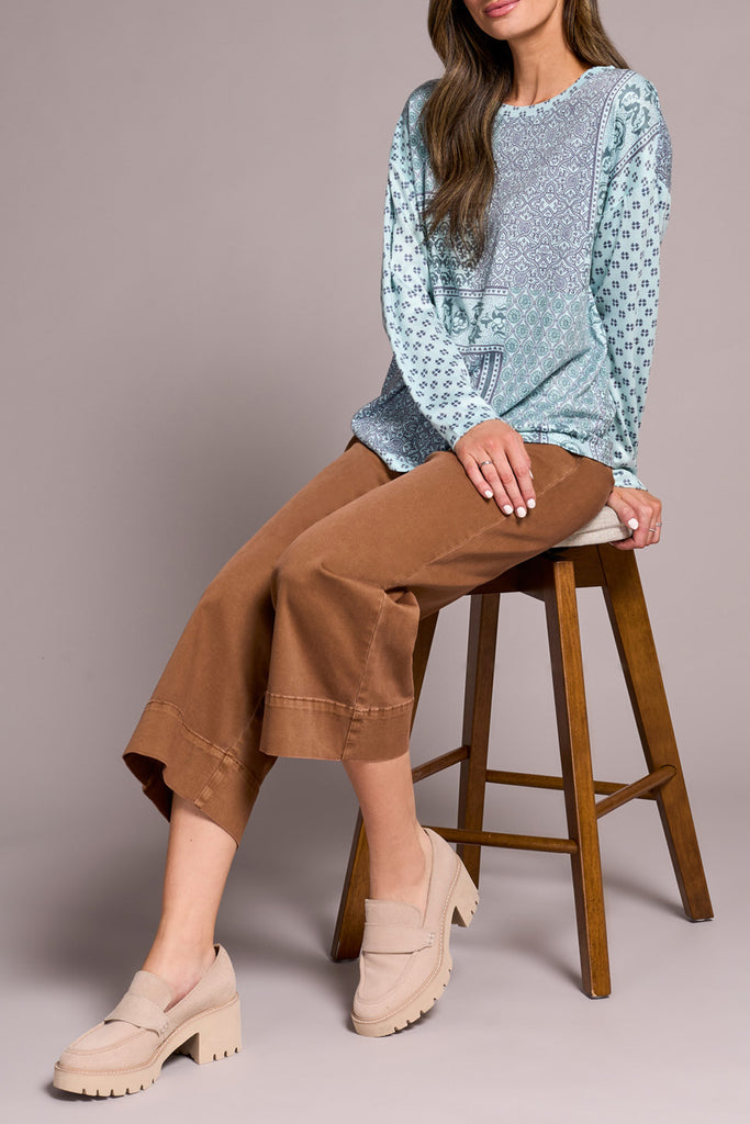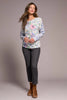 Make a confident style statement in this long-sleeve knit top that combines comfort with eye-catching design. The relaxed silhouette and drop shoulders create an easy, laid-back vibe perfect for everyday wear, while the printed fuzzy knit fabric wraps you in cozy warmth. Contrasting sleeves add visual interest and modern edge to your look, giving you a piece that feels both approachable and fashion-forward.