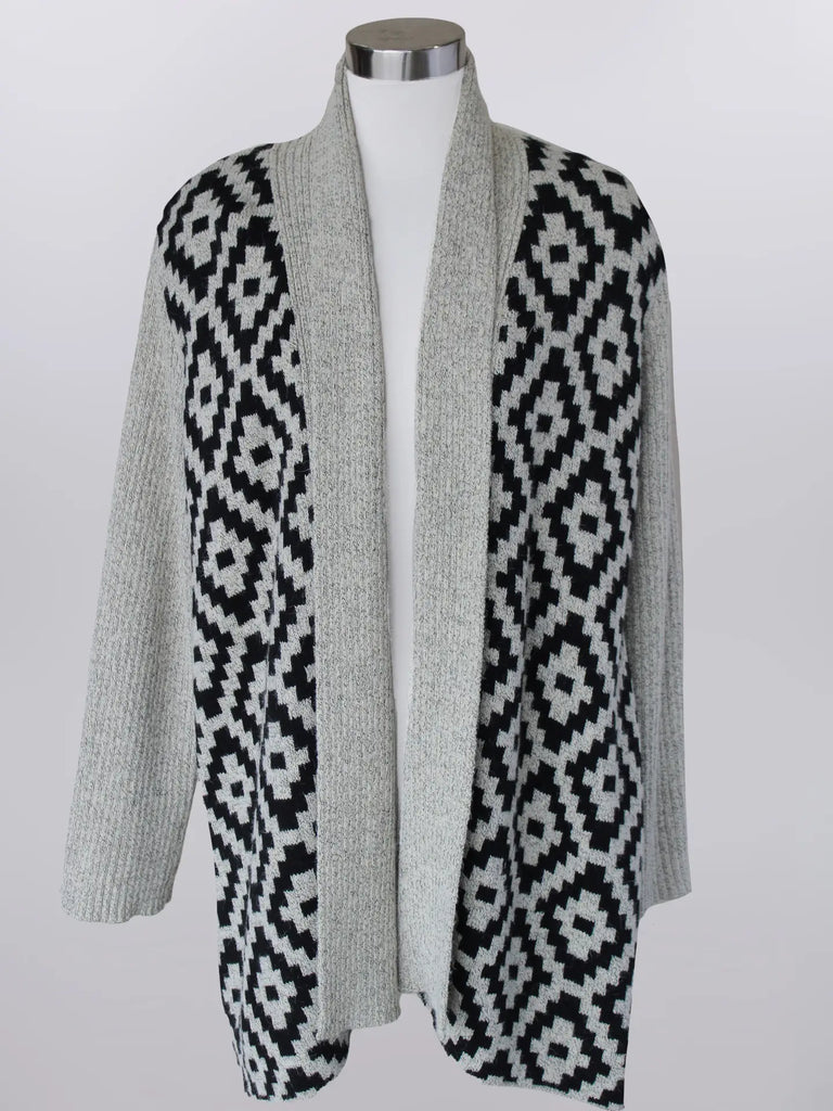 Cozy Long Sleeve Cardigan Open Front Shawl Collar Ribbed Sleeve/Collar Diamond Oatmeal/Black