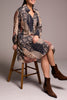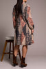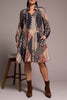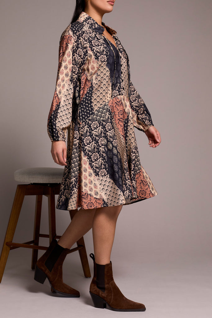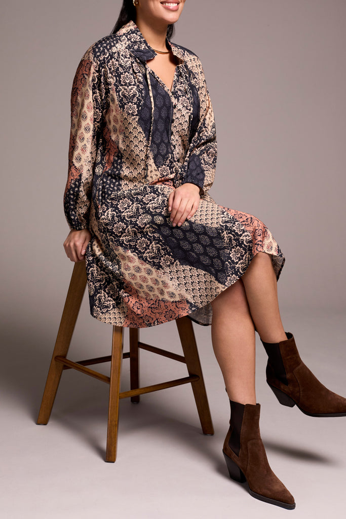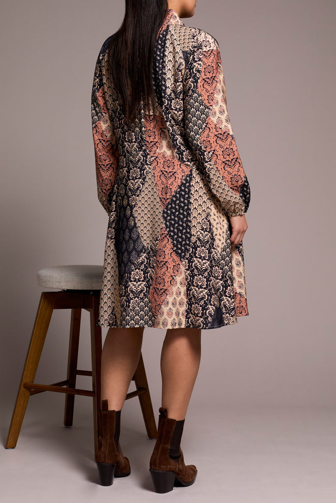 Stand out comfortably in this relaxed shift dress featuring a striking printed patchwork design that draws the eye. The notched neckline lends a refined detail, and the long puff sleeves add fashionable coverage. Convenient pockets provide a subtle spot for carrying your daily necessities.