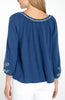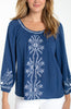 Effortless style meets comfort in this Liberty Blue top, featuring a relaxed scoop neckline and flowing silhouette. Delicate white embroidery adds a charming, handcrafted touch that elevates your everyday look. Perfect for layering or wearing solo, this versatile piece transitions seamlessly from casual outings to relaxed gatherings.