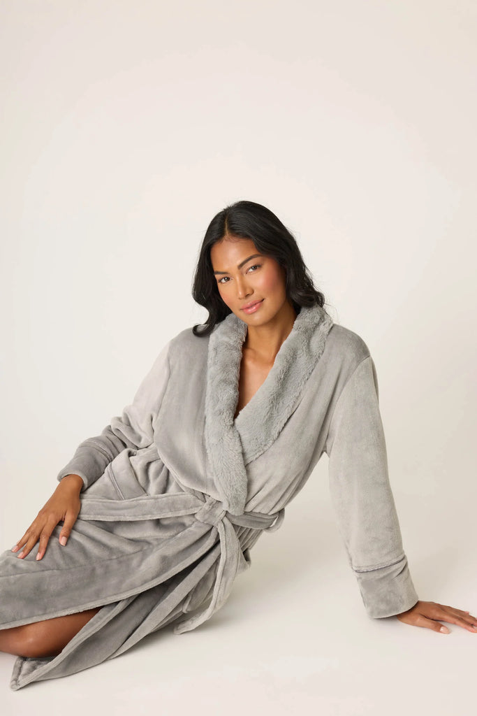 Experience ultimate comfort with this cozy, plush robe. Crafted from silky-soft fleece, it features a mid-length design, shawl collar, self-tie belt, and spacious patch pockets. The gentle frost gray shade adds a serene, contemporary feel to your relaxation time.